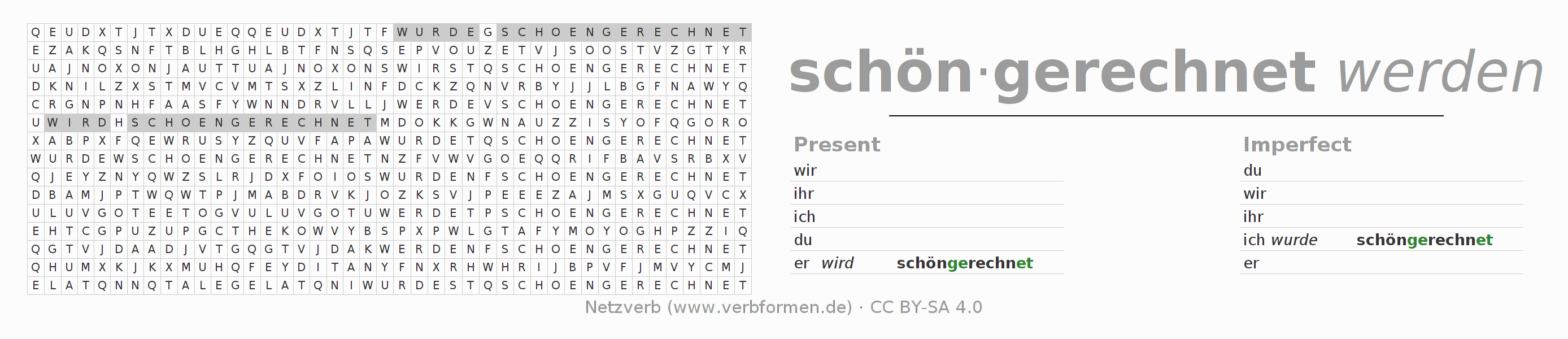 With these search word puzzles you can learn the conjugation of the German verb schönrechnen.