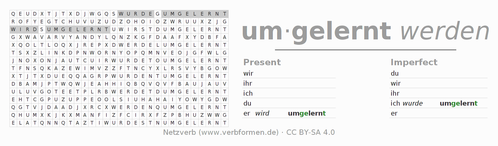 With these search word puzzles you can learn the conjugation of the German verb umlernen.