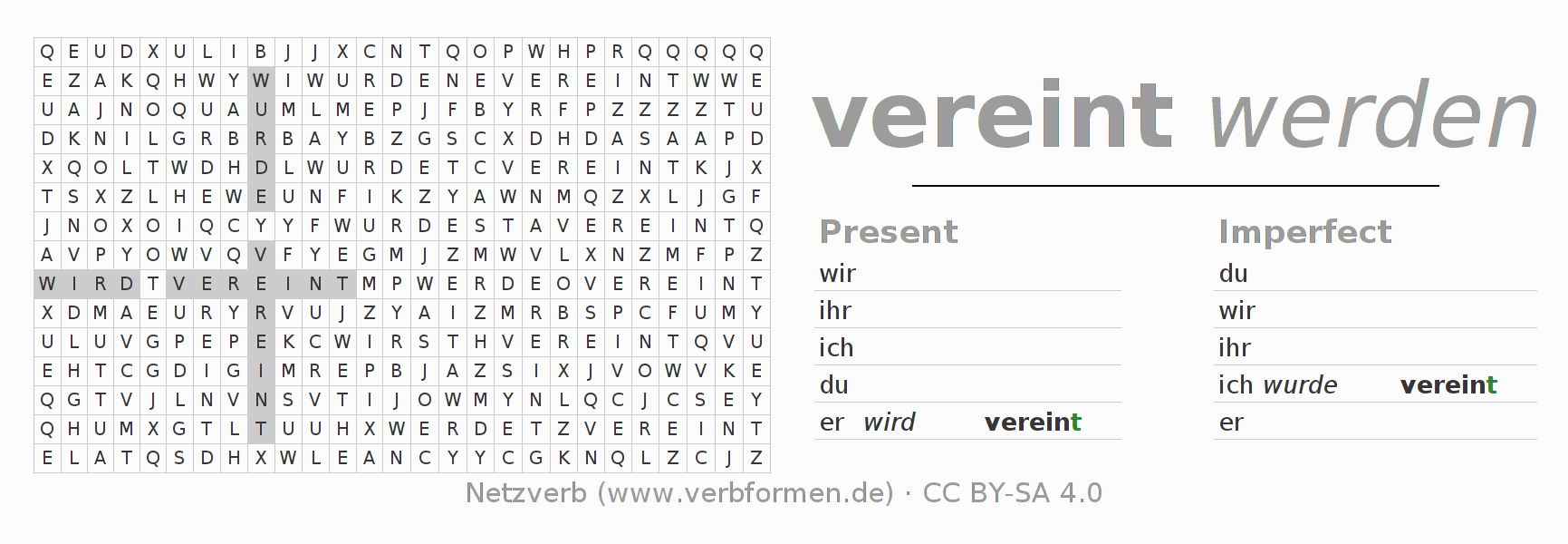 With these search word puzzles you can learn the conjugation of the German verb vereinen.