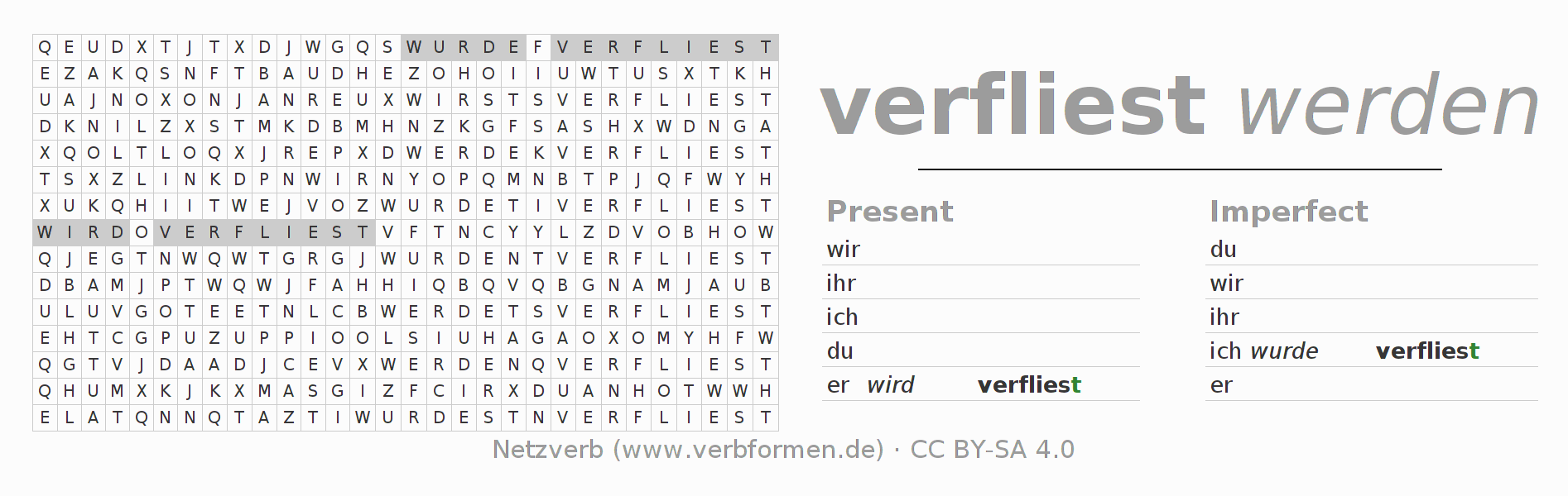 With these search word puzzles you can learn the conjugation of the German verb verfliesen.