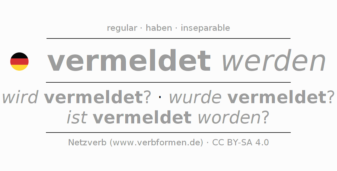 Worksheets are used generally for the conjugation of the verb vermelden in teaching. The materials can be used as Open Educational Resources (OER) for exercises, for games and as Tasks (CC BY-SA 4.0). There are many different types of tasks available for the verb vermelden. These are overview sheets with complete conjugation, puzzles and games that require joint learning. The entire educational material is available for free as a PDF download, as pictures and as an interactive browser version. In addition to the tasks, countless examples for vermelden also provide an aid to using the verb.