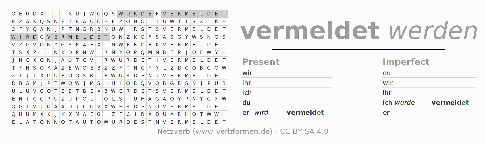 With these search word puzzles you can learn the conjugation of the German verb vermelden.