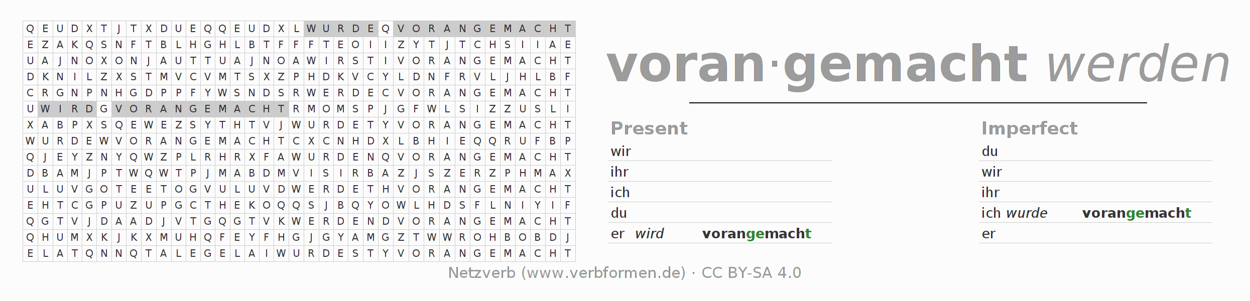 Worksheets are used generally for the conjugation of the verb voranmachen in teaching. The materials can be used as Open Educational Resources (OER) for exercises, for games and as Tasks (CC BY-SA 4.0). There are many different types of tasks available for the verb voranmachen. These are overview sheets with complete conjugation, puzzles and games that require joint learning. The entire educational material is available for free as a PDF download, as pictures and as an interactive browser version. In addition to the tasks, countless examples for voranmachen also provide an aid to using the verb.