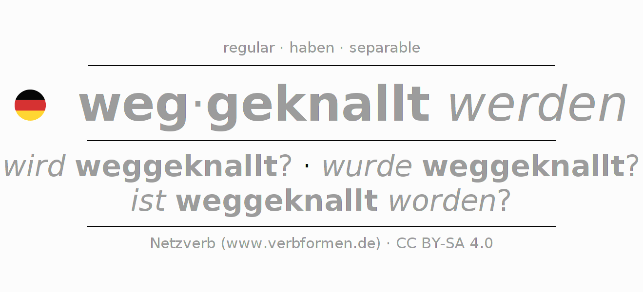 Worksheets are used generally for the conjugation of the verb wegknallen in teaching. The materials can be used as Open Educational Resources (OER) for exercises, for games and as Tasks (CC BY-SA 4.0). There are many different types of tasks available for the verb wegknallen. These are overview sheets with complete conjugation, puzzles and games that require joint learning. The entire educational material is available for free as a PDF download, as pictures and as an interactive browser version. In addition to the tasks, countless examples for wegknallen also provide an aid to using the verb.