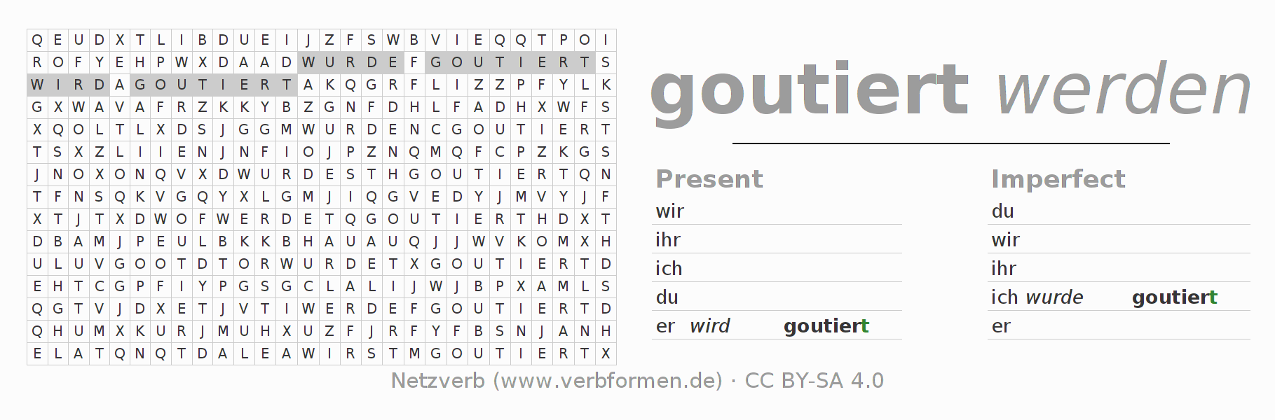 With these search word puzzles you can learn the conjugation of the German verb goutieren.