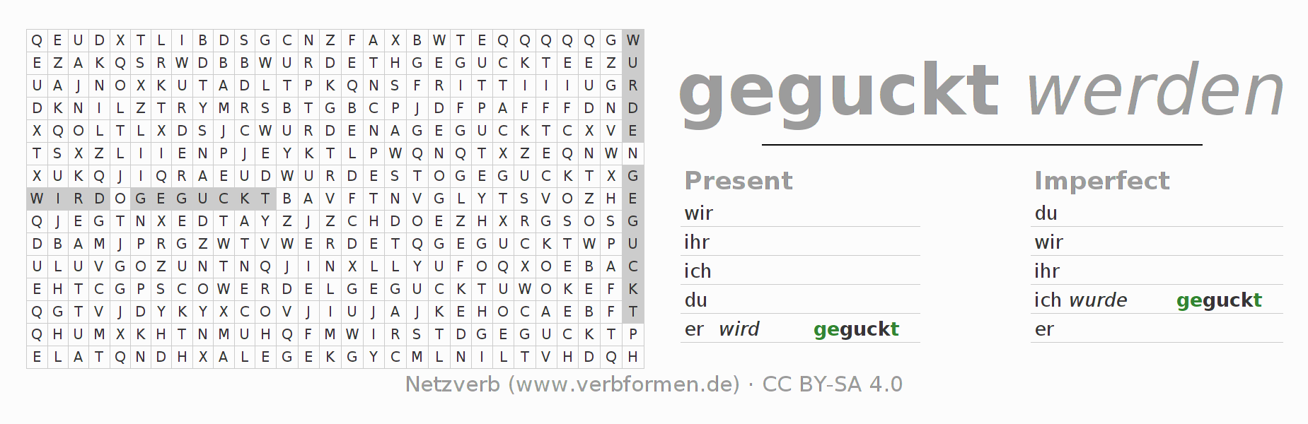 With these search word puzzles you can learn the conjugation of the German verb gucken.