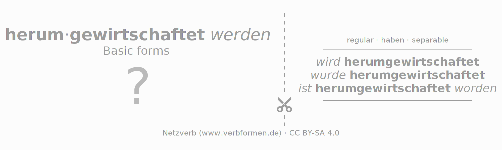 Worksheets are used generally for the conjugation of the verb herumwirtschaften in teaching. The materials can be used as Open Educational Resources (OER) for exercises, for games and as Tasks (CC BY-SA 4.0). There are many different types of tasks available for the verb herumwirtschaften. These are overview sheets with complete conjugation, puzzles and games that require joint learning. The entire educational material is available for free as a PDF download, as pictures and as an interactive browser version. In addition to the tasks, countless examples for herumwirtschaften also provide an aid to using the verb.