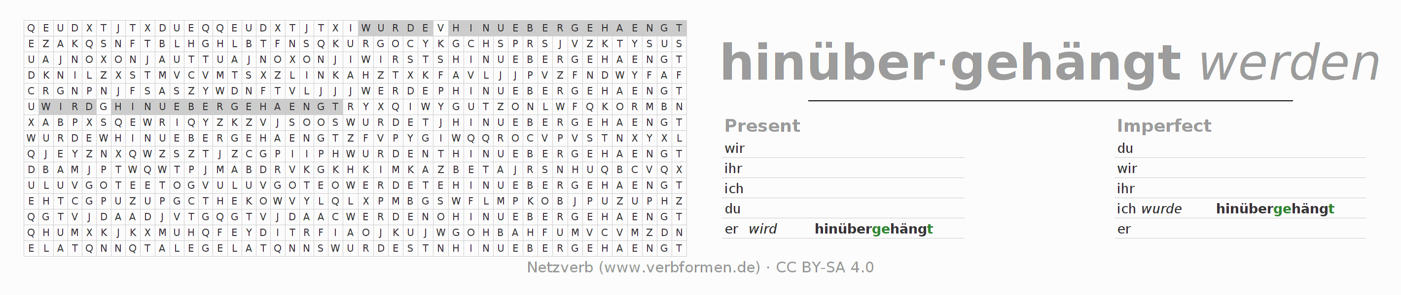 With these search word puzzles you can learn the conjugation of the German verb hinüberhängen.