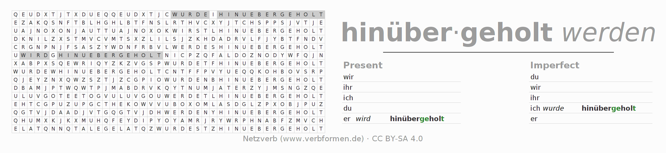 With these search word puzzles you can learn the conjugation of the German verb hinüberholen.
