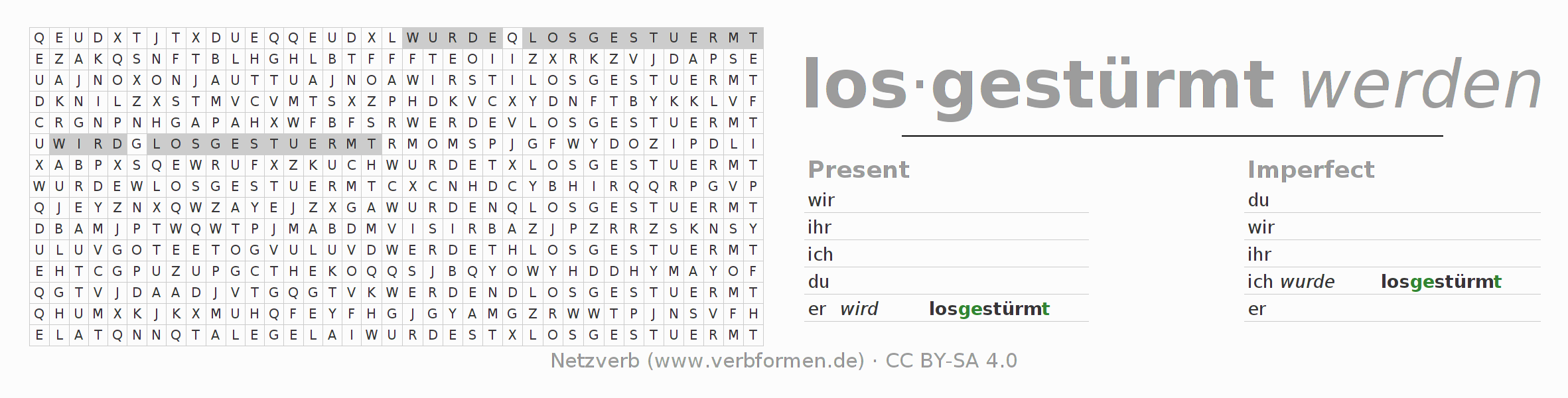 With these search word puzzles you can learn the conjugation of the German verb losstürmen.