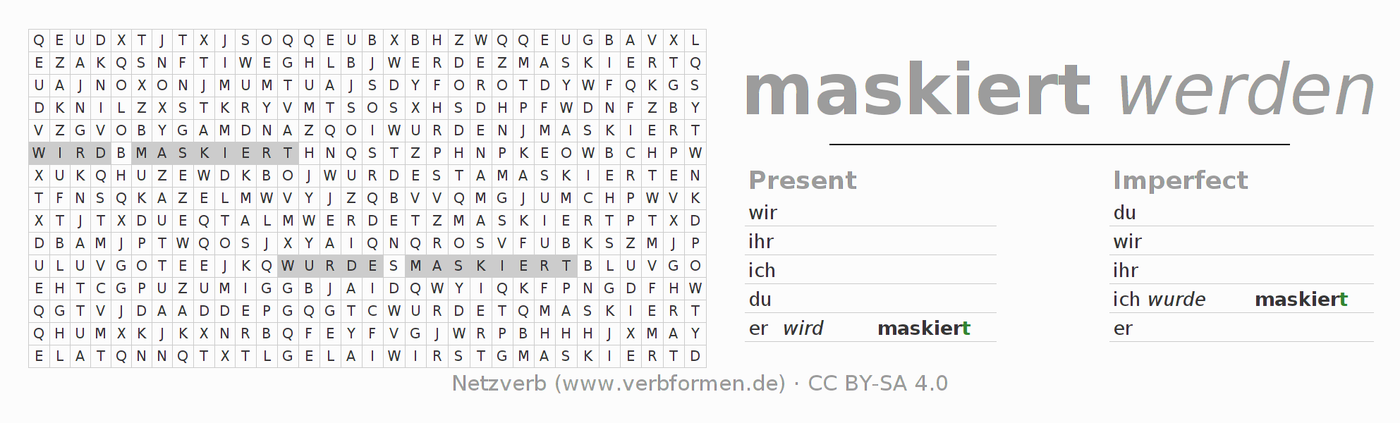 With these search word puzzles you can learn the conjugation of the German verb maskieren.