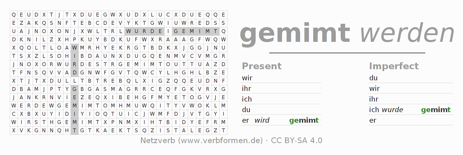 With these search word puzzles you can learn the conjugation of the German verb mimen.