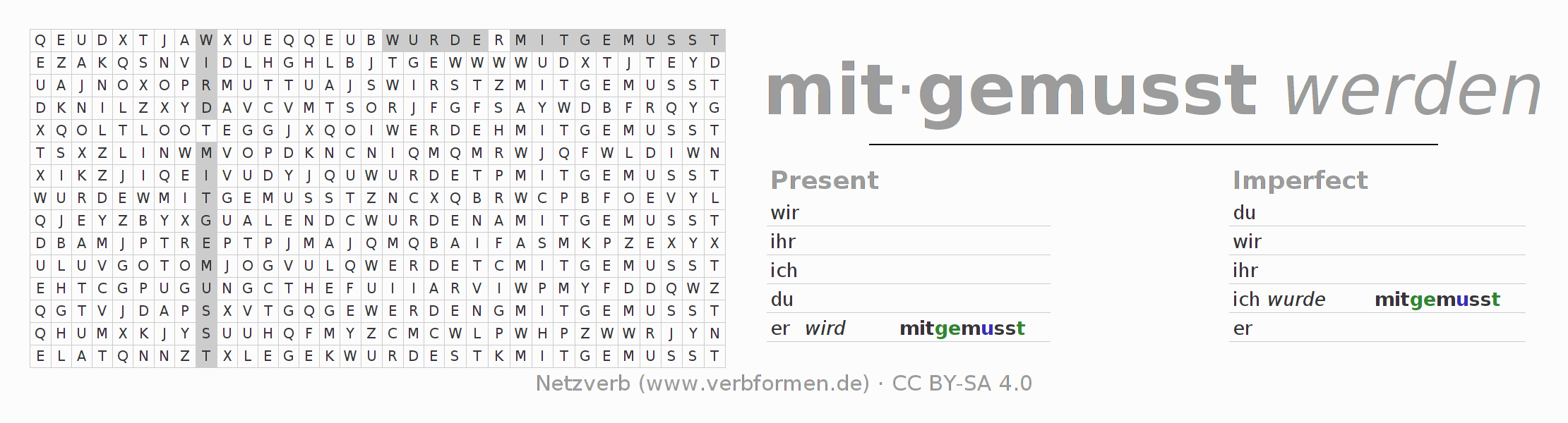 With these search word puzzles you can learn the conjugation of the German verb mitmüssen.