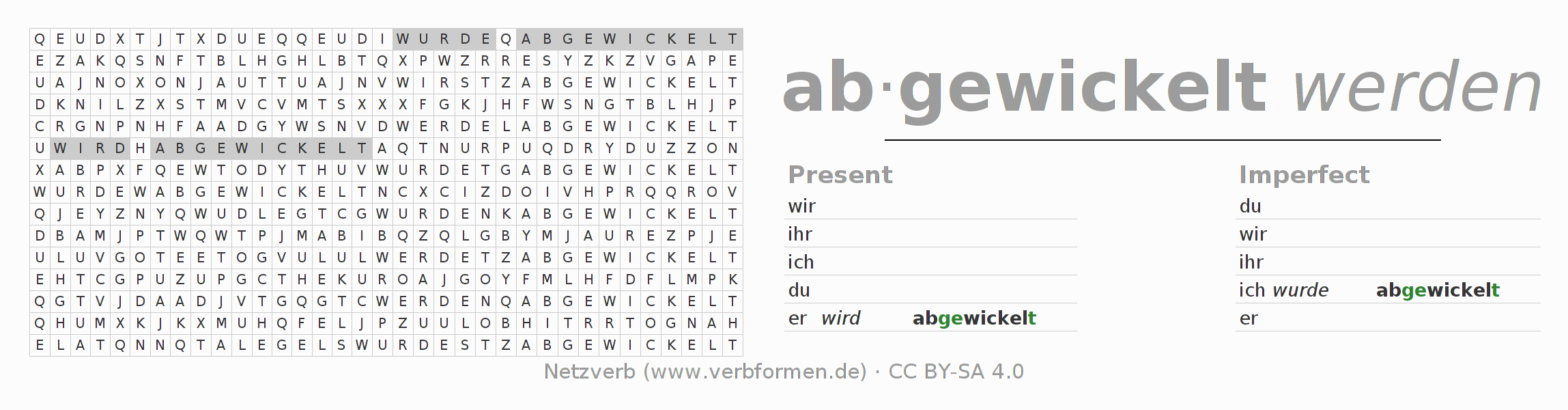 With these search word puzzles you can learn the conjugation of the German verb abwickeln.