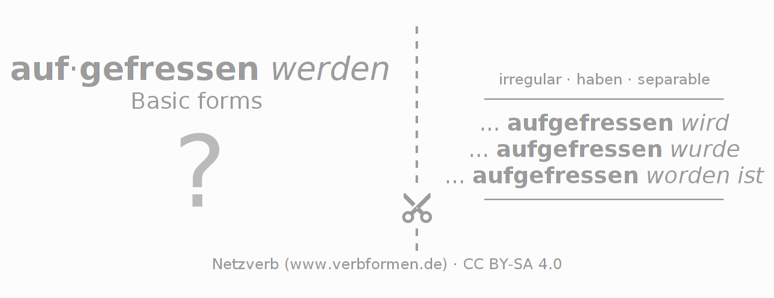 Worksheets are used generally for the conjugation of the verb auffressen in teaching. The materials can be used as Open Educational Resources (OER) for exercises, for games and as Tasks (CC BY-SA 4.0). There are many different types of tasks available for the verb auffressen. These are overview sheets with complete conjugation, puzzles and games that require joint learning. The entire educational material is available for free as a PDF download, as pictures and as an interactive browser version. In addition to the tasks, countless examples for auffressen also provide an aid to using the verb.