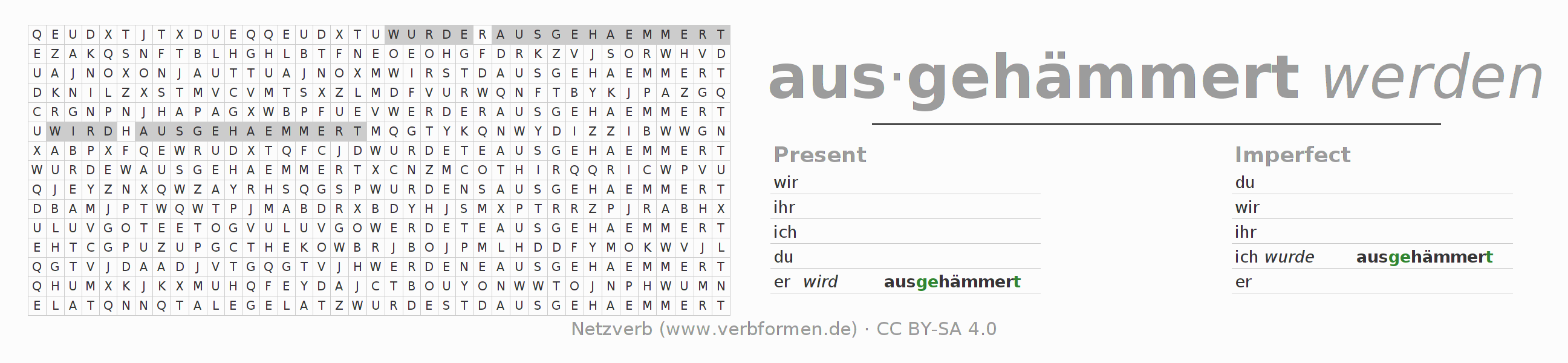 With these search word puzzles you can learn the conjugation of the German verb aushämmern.
