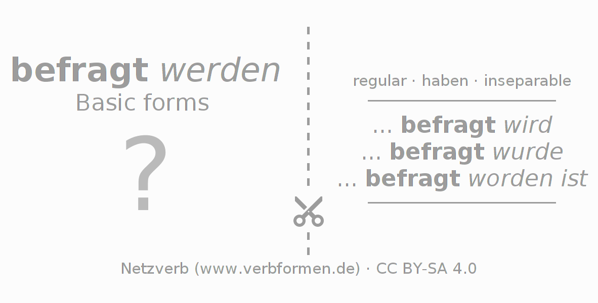 Worksheets are used generally for the conjugation of the verb befragen in teaching. The materials can be used as Open Educational Resources (OER) for exercises, for games and as Tasks (CC BY-SA 4.0). There are many different types of tasks available for the verb befragen (regelm). These are overview sheets with complete conjugation, puzzles and games that require joint learning. The entire educational material is available for free as a PDF download, as pictures and as an interactive browser version. In addition to the tasks, countless examples for befragen also provide an aid to using the verb.