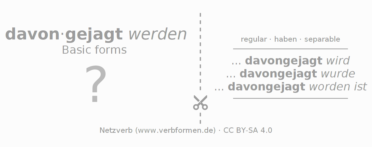 Worksheets are used generally for the conjugation of the verb davonjagen in teaching. The materials can be used as Open Educational Resources (OER) for exercises, for games and as Tasks (CC BY-SA 4.0). There are many different types of tasks available for the verb davonjagen (hat). These are overview sheets with complete conjugation, puzzles and games that require joint learning. The entire educational material is available for free as a PDF download, as pictures and as an interactive browser version. In addition to the tasks, countless examples for davonjagen also provide an aid to using the verb.