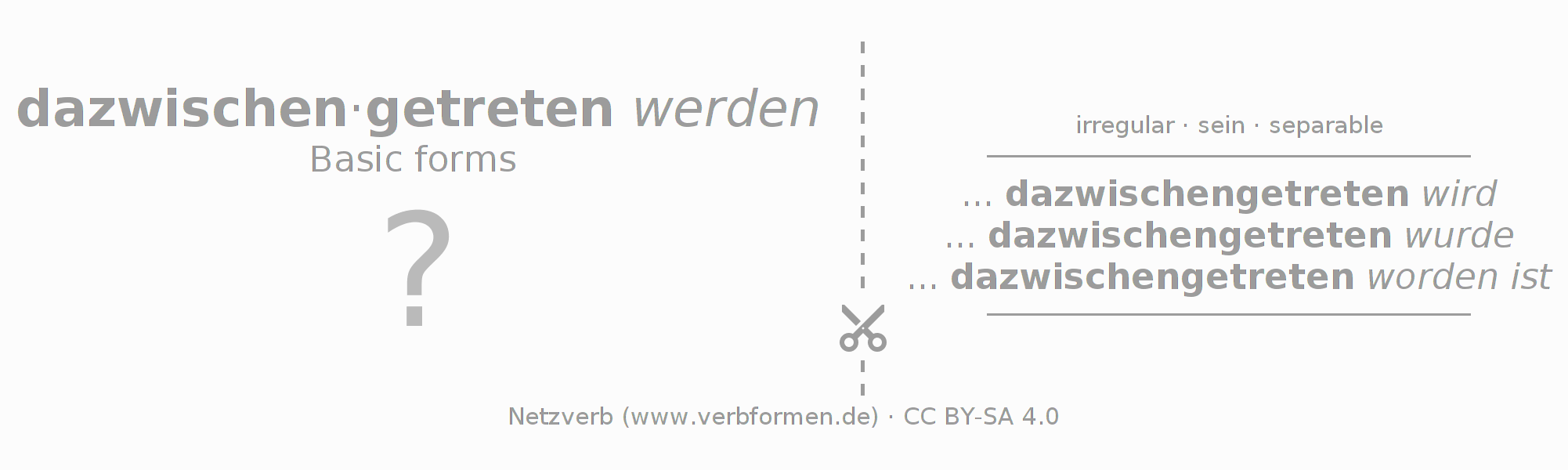 Flash cards, learning cards, learning notes for all tenses of the verb dazwischentreten