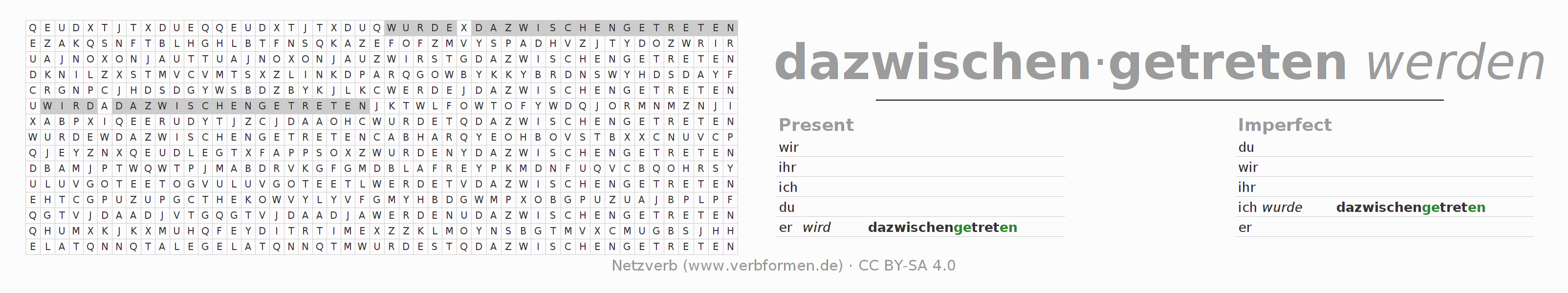 Worksheets are used generally for the conjugation of the verb dazwischentreten in teaching. The materials can be used as Open Educational Resources (OER) for exercises, for games and as Tasks (CC BY-SA 4.0). There are many different types of tasks available for the verb dazwischentreten. These are overview sheets with complete conjugation, puzzles and games that require joint learning. The entire educational material is available for free as a PDF download, as pictures and as an interactive browser version. In addition to the tasks, countless examples for dazwischentreten also provide an aid to using the verb.