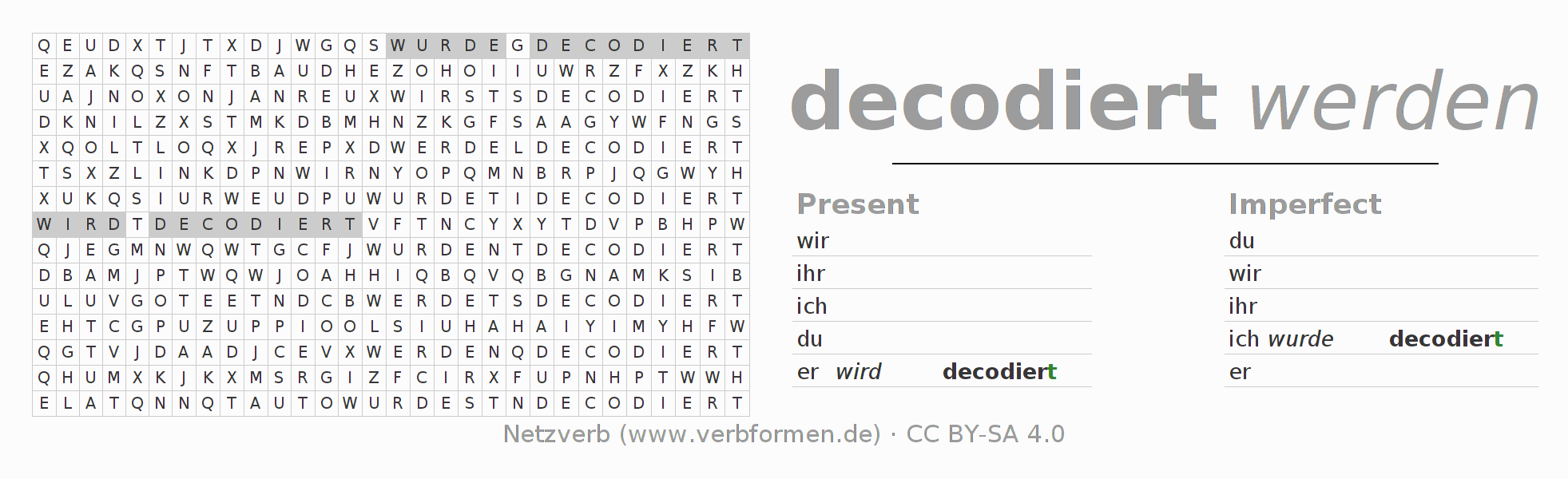 With these search word puzzles you can learn the conjugation of the German verb decodieren.