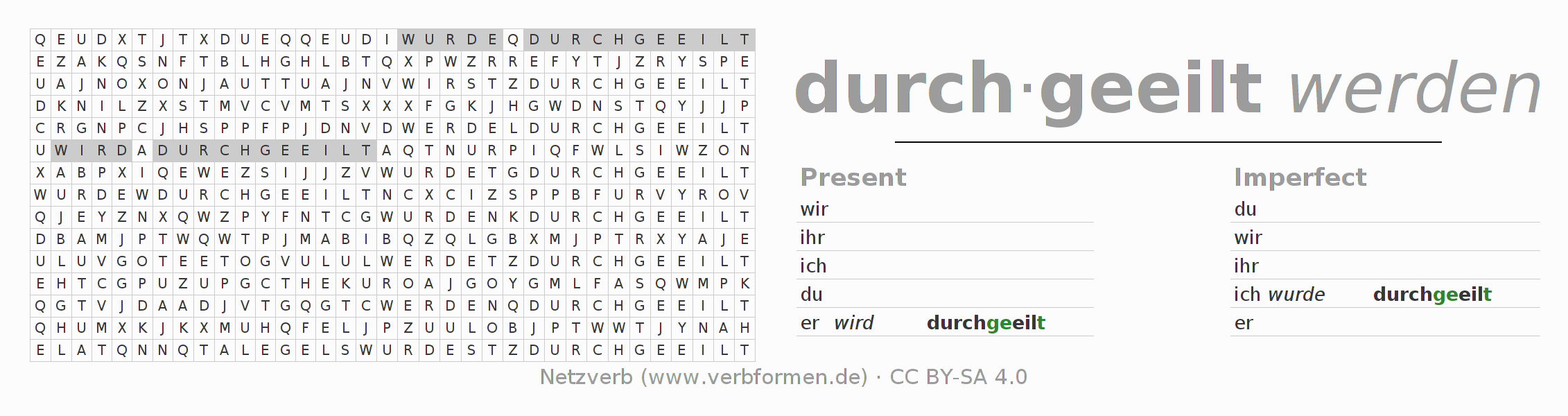 With these search word puzzles you can learn the conjugation of the German verb durcheilen.