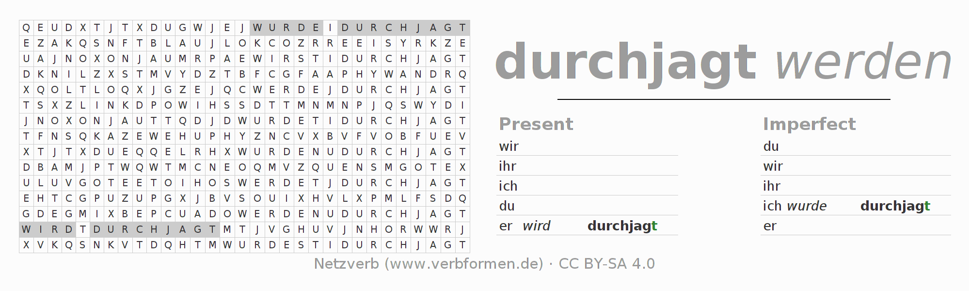 With these search word puzzles you can learn the conjugation of the German verb durchjagen.