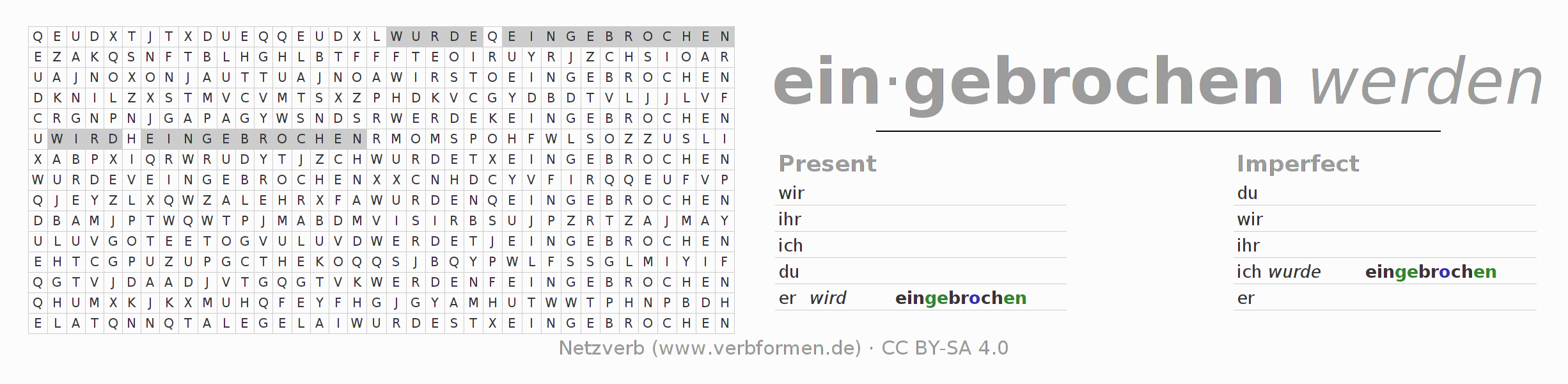 With these search word puzzles you can learn the conjugation of the German verb einbrechen.