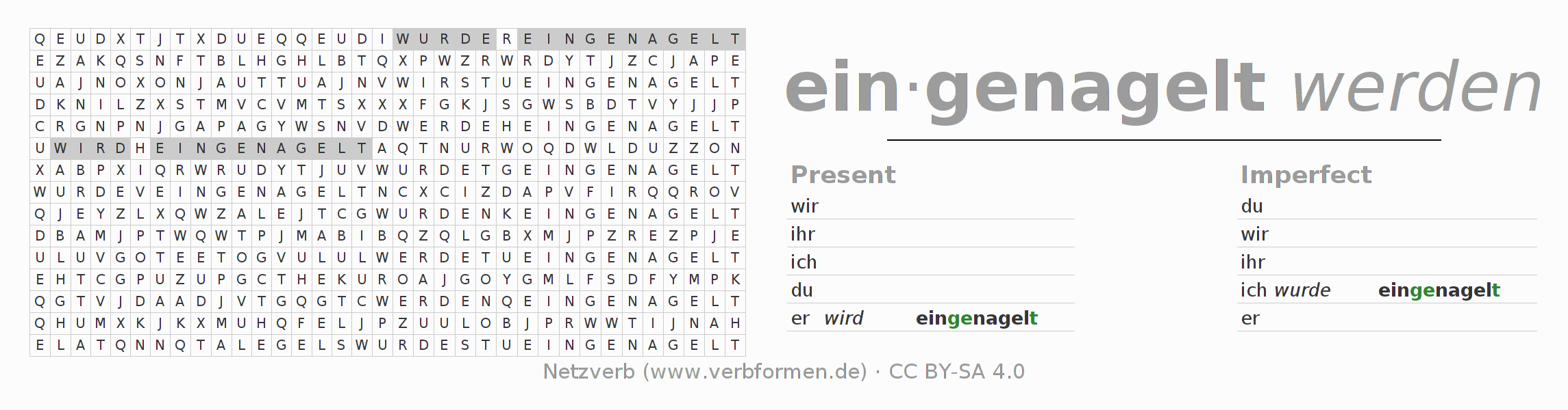 Worksheets are used generally for the conjugation of the verb einnageln in teaching. The materials can be used as Open Educational Resources (OER) for exercises, for games and as Tasks (CC BY-SA 4.0). There are many different types of tasks available for the verb einnageln. These are overview sheets with complete conjugation, puzzles and games that require joint learning. The entire educational material is available for free as a PDF download, as pictures and as an interactive browser version. In addition to the tasks, countless examples for einnageln also provide an aid to using the verb.