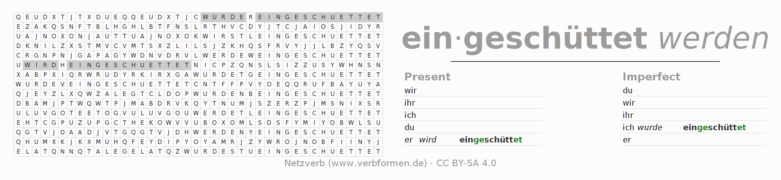With these search word puzzles you can learn the conjugation of the German verb einschütten.