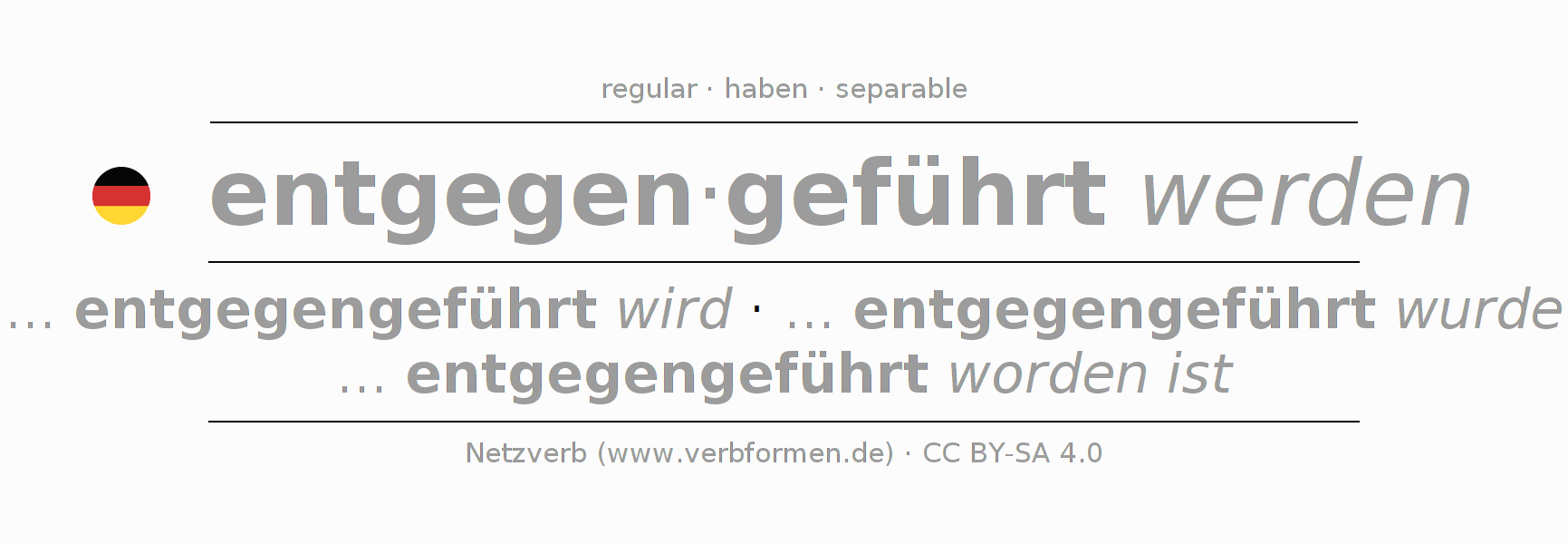 Worksheets are used generally for the conjugation of the verb entgegenführen in teaching. The materials can be used as Open Educational Resources (OER) for exercises, for games and as Tasks (CC BY-SA 4.0). There are many different types of tasks available for the verb entgegenführen. These are overview sheets with complete conjugation, puzzles and games that require joint learning. The entire educational material is available for free as a PDF download, as pictures and as an interactive browser version. In addition to the tasks, countless examples for entgegenführen also provide an aid to using the verb.