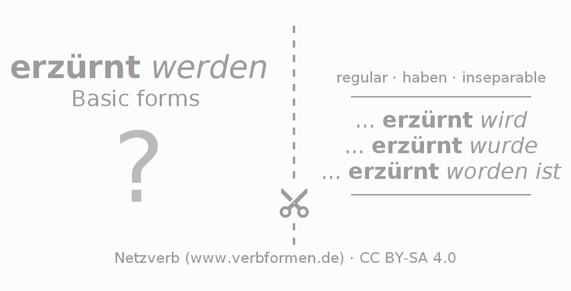 Worksheets are used generally for the conjugation of the verb erzürnen in teaching. The materials can be used as Open Educational Resources (OER) for exercises, for games and as Tasks (CC BY-SA 4.0). There are many different types of tasks available for the verb erzürnen (hat). These are overview sheets with complete conjugation, puzzles and games that require joint learning. The entire educational material is available for free as a PDF download, as pictures and as an interactive browser version. In addition to the tasks, countless examples for erzürnen also provide an aid to using the verb.