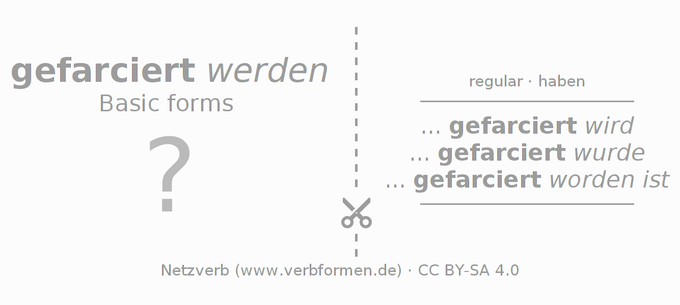 Worksheets are used generally for the conjugation of the verb farcieren in teaching. The materials can be used as Open Educational Resources (OER) for exercises, for games and as Tasks (CC BY-SA 4.0). There are many different types of tasks available for the verb farcieren. These are overview sheets with complete conjugation, puzzles and games that require joint learning. The entire educational material is available for free as a PDF download, as pictures and as an interactive browser version. In addition to the tasks, countless examples for farcieren also provide an aid to using the verb.