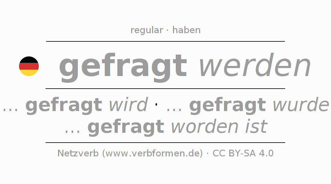 Worksheets are used generally for the conjugation of the verb fragen in teaching. The materials can be used as Open Educational Resources (OER) for exercises, for games and as Tasks (CC BY-SA 4.0). There are many different types of tasks available for the verb fragen (regelm). These are overview sheets with complete conjugation, puzzles and games that require joint learning. The entire educational material is available for free as a PDF download, as pictures and as an interactive browser version. In addition to the tasks, countless examples for fragen also provide an aid to using the verb.