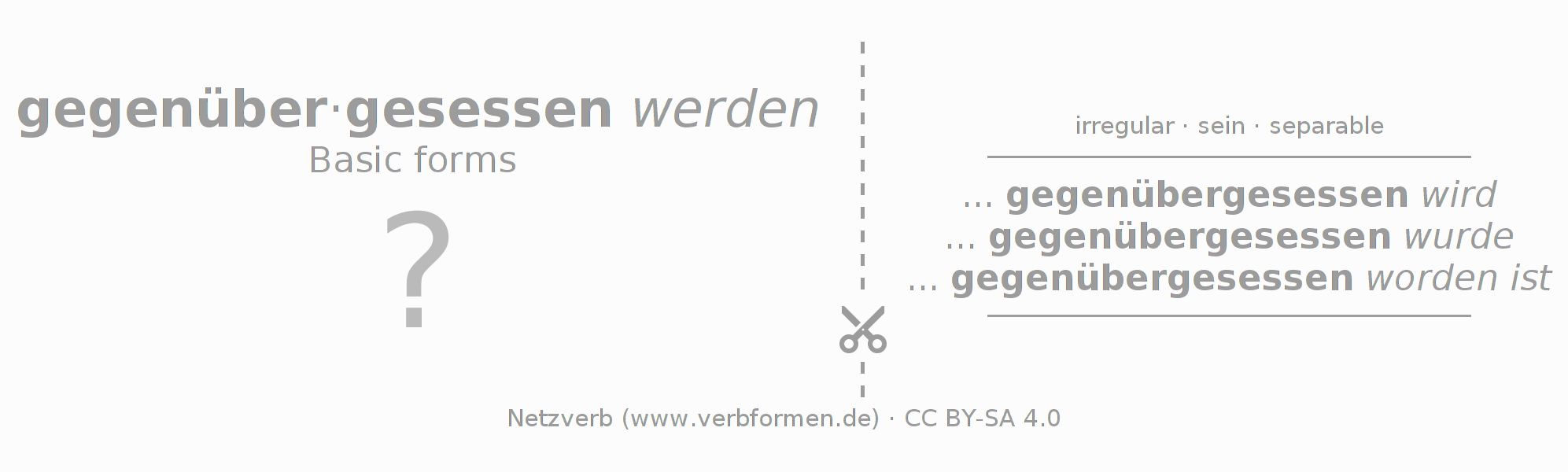 Worksheets are used generally for the conjugation of the verb gegenübersitzen in teaching. The materials can be used as Open Educational Resources (OER) for exercises, for games and as Tasks (CC BY-SA 4.0). There are many different types of tasks available for the verb gegenübersitzen (ist). These are overview sheets with complete conjugation, puzzles and games that require joint learning. The entire educational material is available for free as a PDF download, as pictures and as an interactive browser version. In addition to the tasks, countless examples for gegenübersitzen also provide an aid to using the verb.