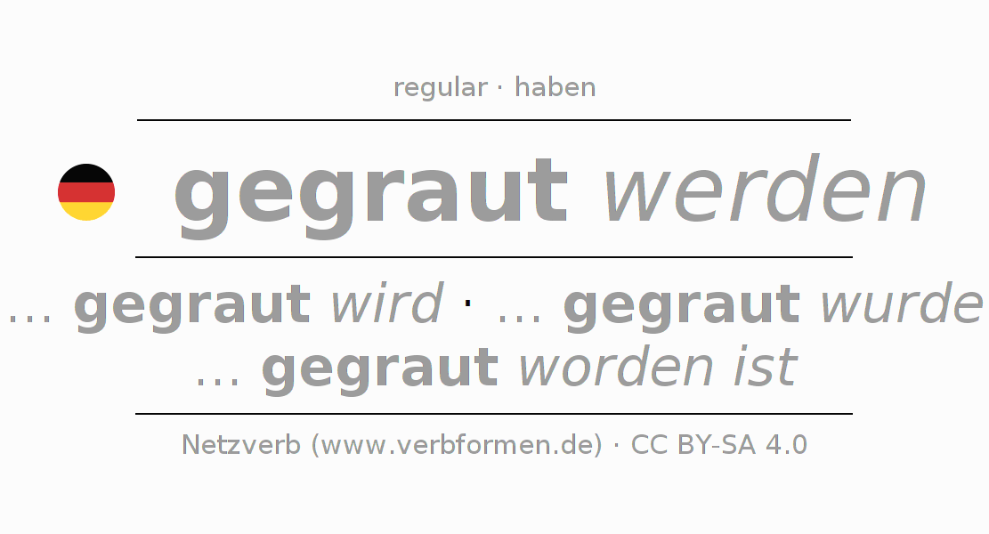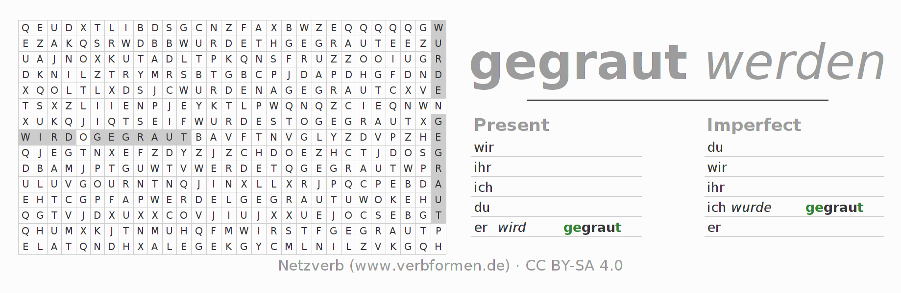 Worksheets are used generally for the conjugation of the verb grauen in teaching. The materials can be used as Open Educational Resources (OER) for exercises, for games and as Tasks (CC BY-SA 4.0). There are many different types of tasks available for the verb grauen. These are overview sheets with complete conjugation, puzzles and games that require joint learning. The entire educational material is available for free as a PDF download, as pictures and as an interactive browser version. In addition to the tasks, countless examples for grauen also provide an aid to using the verb.