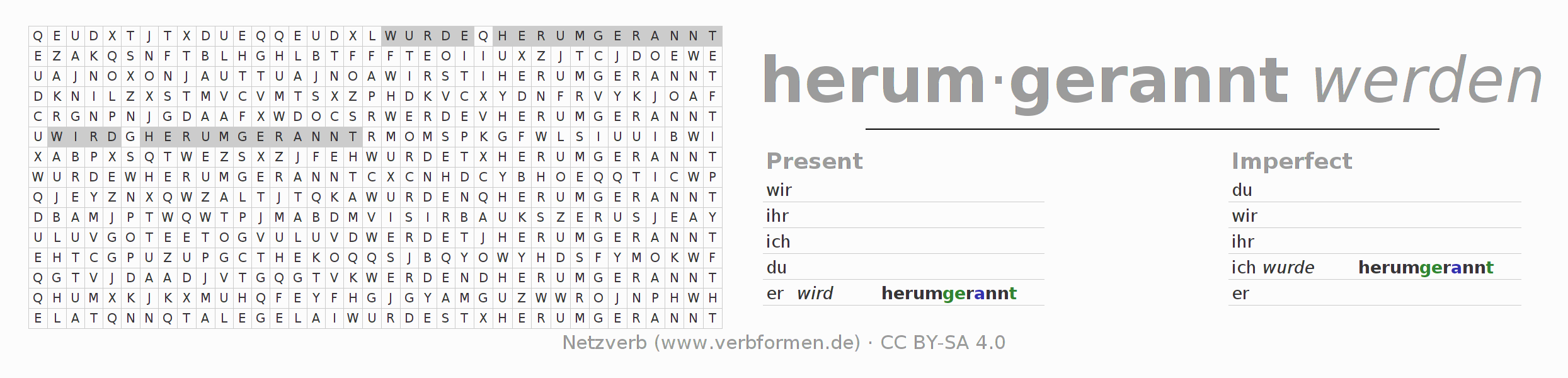 With these search word puzzles you can learn the conjugation of the German verb herumrennen.