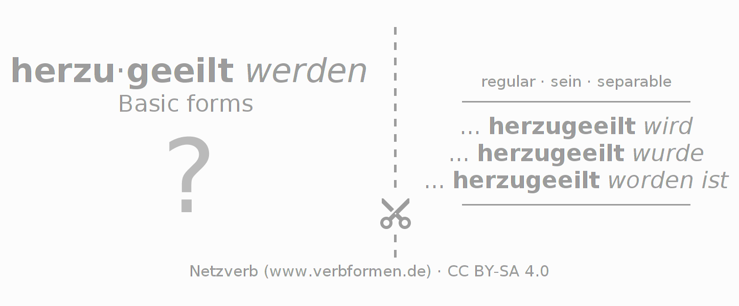 Worksheets are used generally for the conjugation of the verb herzueilen in teaching. The materials can be used as Open Educational Resources (OER) for exercises, for games and as Tasks (CC BY-SA 4.0). There are many different types of tasks available for the verb herzueilen. These are overview sheets with complete conjugation, puzzles and games that require joint learning. The entire educational material is available for free as a PDF download, as pictures and as an interactive browser version. In addition to the tasks, countless examples for herzueilen also provide an aid to using the verb.
