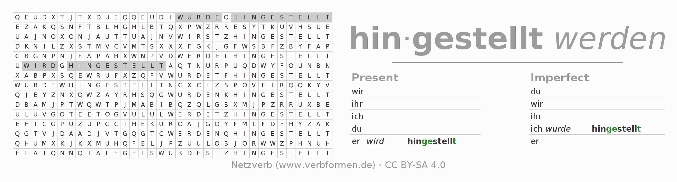 With these search word puzzles you can learn the conjugation of the German verb hinstellen.