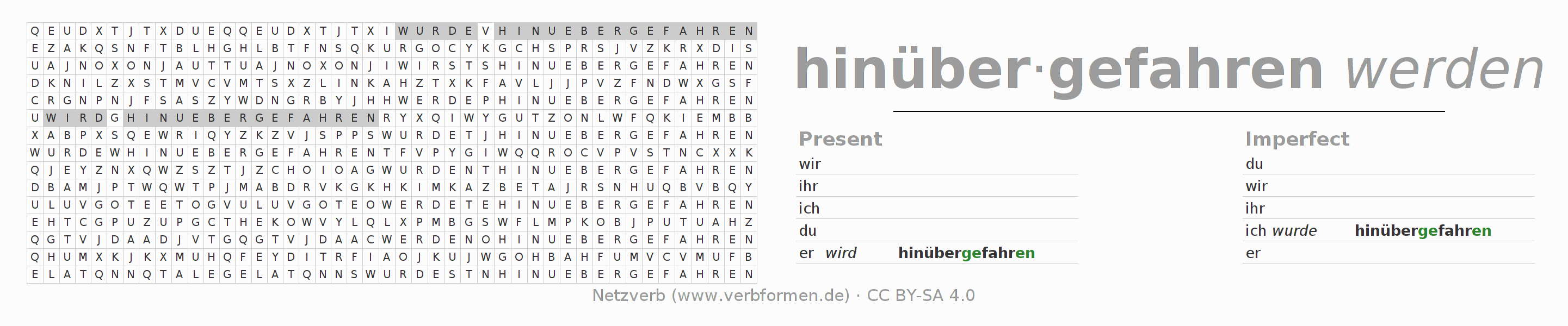 With these search word puzzles you can learn the conjugation of the German verb hinüberfahren.