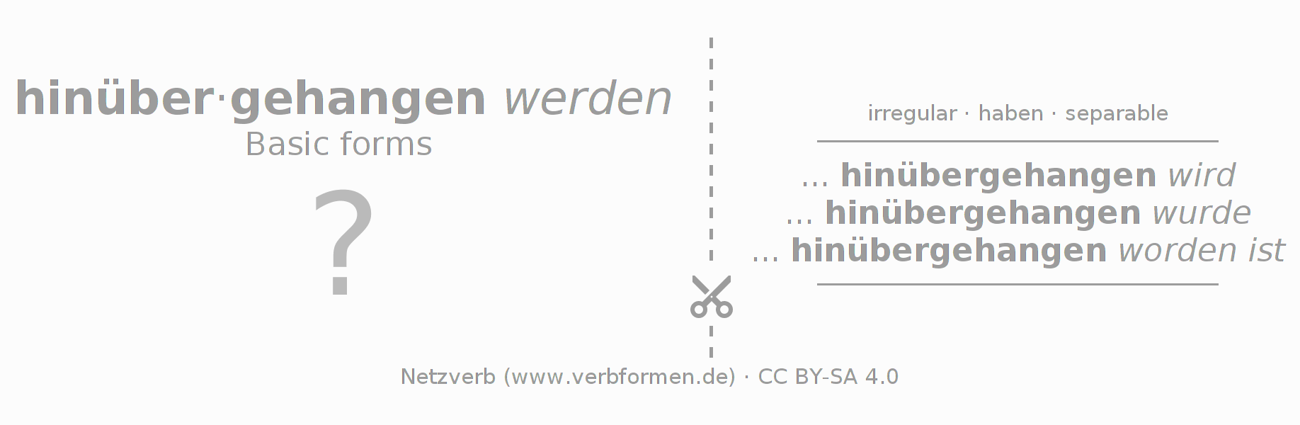 Worksheets are used generally for the conjugation of the verb hinüberhängen in teaching. The materials can be used as Open Educational Resources (OER) for exercises, for games and as Tasks (CC BY-SA 4.0). There are many different types of tasks available for the verb hinüberhängen (unr). These are overview sheets with complete conjugation, puzzles and games that require joint learning. The entire educational material is available for free as a PDF download, as pictures and as an interactive browser version. In addition to the tasks, countless examples for hinüberhängen also provide an aid to using the verb.