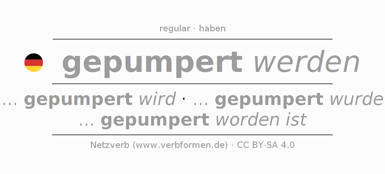 Worksheets are used generally for the conjugation of the verb pumpern in teaching. The materials can be used as Open Educational Resources (OER) for exercises, for games and as Tasks (CC BY-SA 4.0). There are many different types of tasks available for the verb pumpern. These are overview sheets with complete conjugation, puzzles and games that require joint learning. The entire educational material is available for free as a PDF download, as pictures and as an interactive browser version. In addition to the tasks, countless examples for pumpern also provide an aid to using the verb.