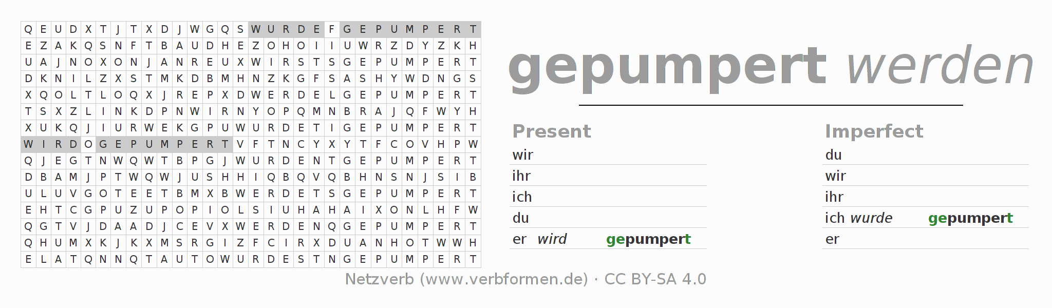 With these search word puzzles you can learn the conjugation of the German verb pumpern.