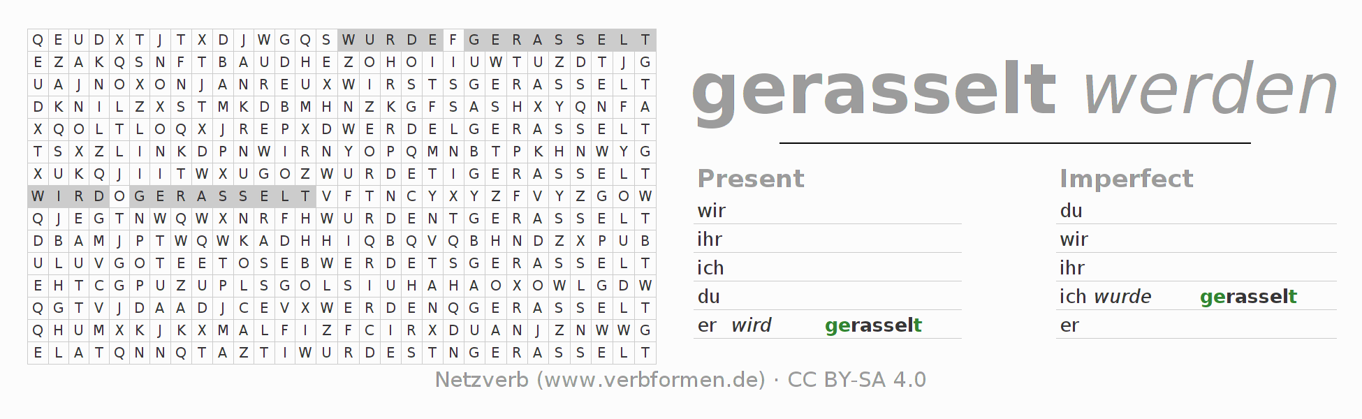 With these search word puzzles you can learn the conjugation of the German verb rasseln.