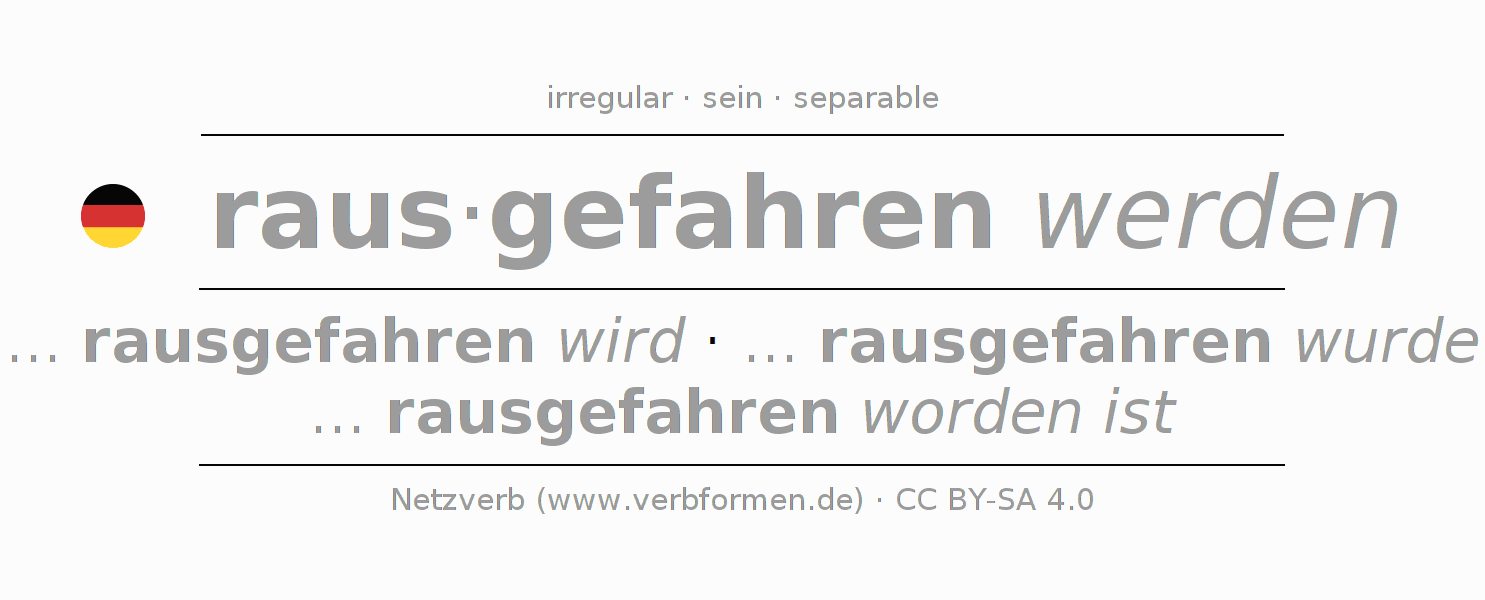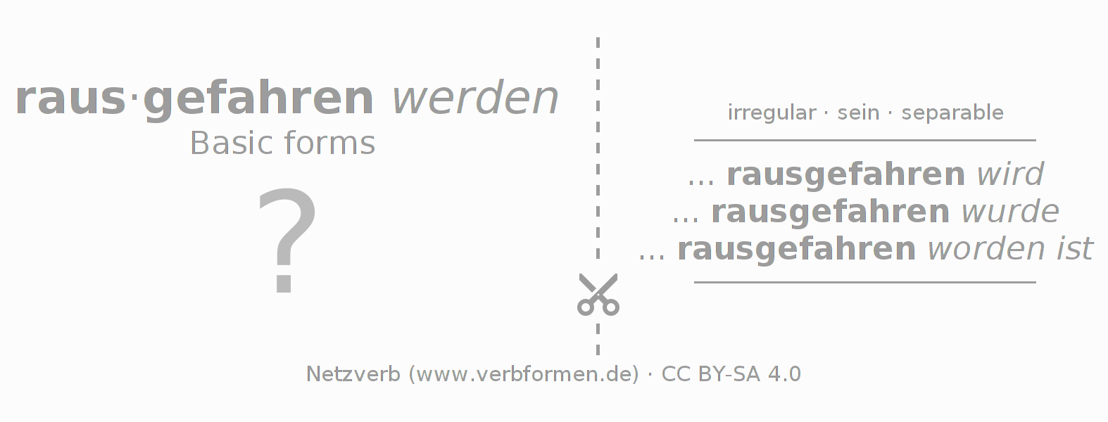 Worksheets are used generally for the conjugation of the verb rausfahren in teaching. The materials can be used as Open Educational Resources (OER) for exercises, for games and as Tasks (CC BY-SA 4.0). There are many different types of tasks available for the verb rausfahren (ist). These are overview sheets with complete conjugation, puzzles and games that require joint learning. The entire educational material is available for free as a PDF download, as pictures and as an interactive browser version. In addition to the tasks, countless examples for rausfahren also provide an aid to using the verb.