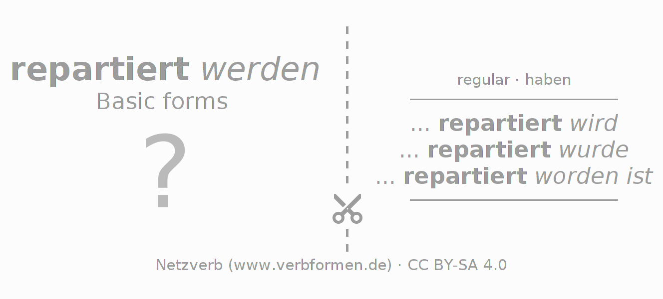 Worksheets are used generally for the conjugation of the verb repartieren in teaching. The materials can be used as Open Educational Resources (OER) for exercises, for games and as Tasks (CC BY-SA 4.0). There are many different types of tasks available for the verb repartieren. These are overview sheets with complete conjugation, puzzles and games that require joint learning. The entire educational material is available for free as a PDF download, as pictures and as an interactive browser version. In addition to the tasks, countless examples for repartieren also provide an aid to using the verb.