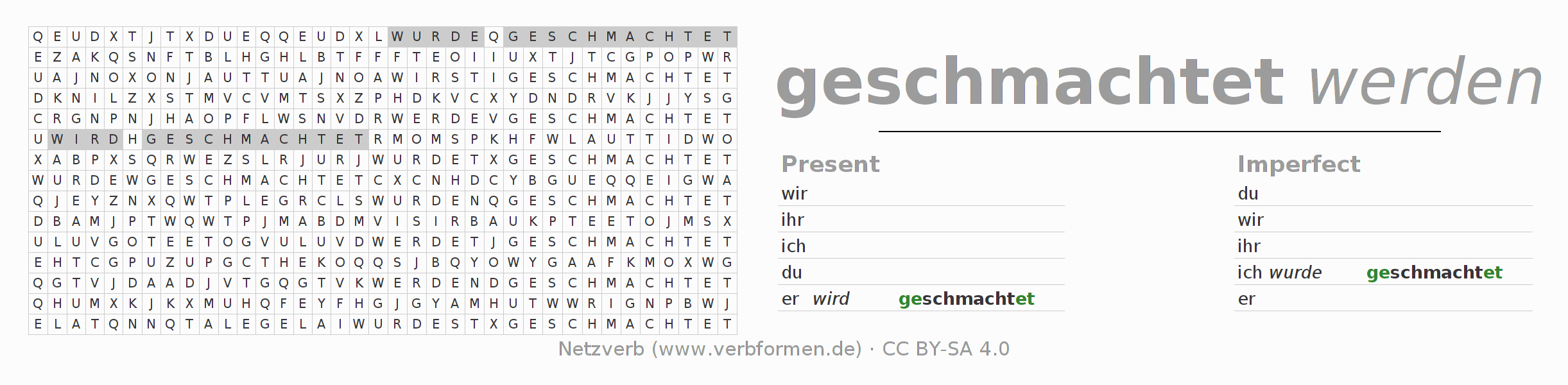 With these search word puzzles you can learn the conjugation of the German verb schmachten.