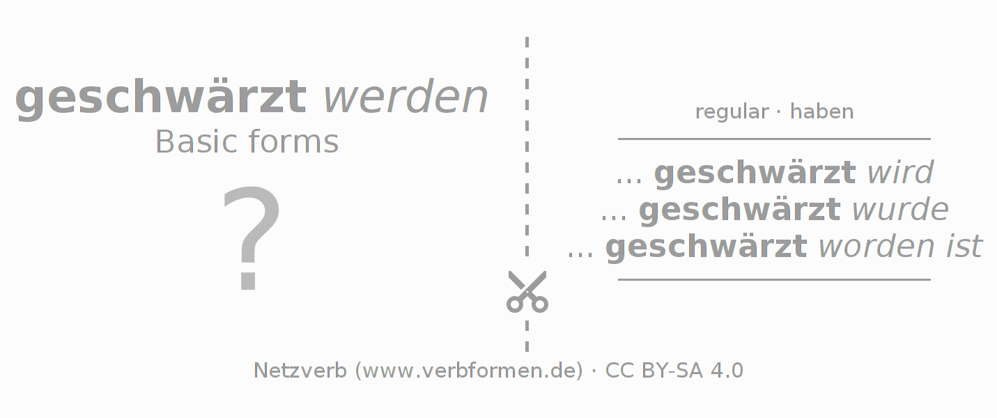 Worksheets are used generally for the conjugation of the verb schwärzen in teaching. The materials can be used as Open Educational Resources (OER) for exercises, for games and as Tasks (CC BY-SA 4.0). There are many different types of tasks available for the verb schwärzen. These are overview sheets with complete conjugation, puzzles and games that require joint learning. The entire educational material is available for free as a PDF download, as pictures and as an interactive browser version. In addition to the tasks, countless examples for schwärzen also provide an aid to using the verb.