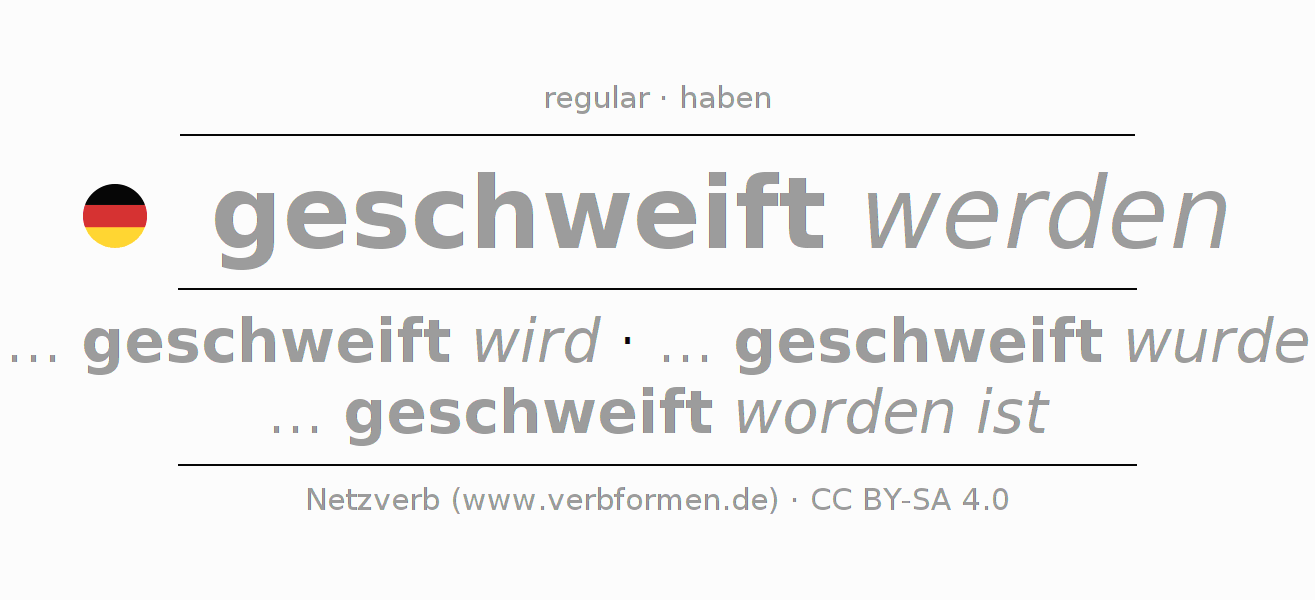 Worksheets are used generally for the conjugation of the verb schweifen in teaching. The materials can be used as Open Educational Resources (OER) for exercises, for games and as Tasks (CC BY-SA 4.0). There are many different types of tasks available for the verb schweifen (hat). These are overview sheets with complete conjugation, puzzles and games that require joint learning. The entire educational material is available for free as a PDF download, as pictures and as an interactive browser version. In addition to the tasks, countless examples for schweifen also provide an aid to using the verb.