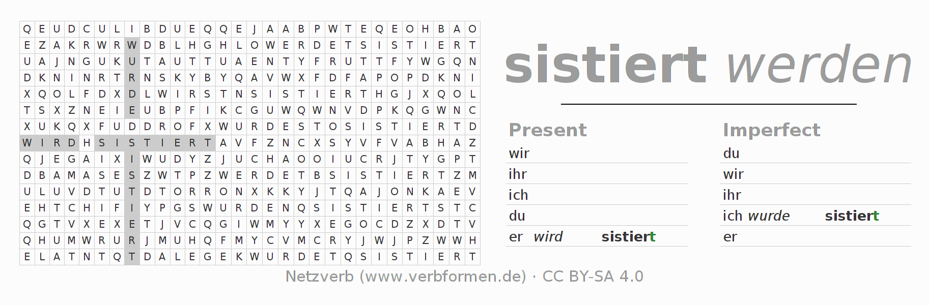 With these search word puzzles you can learn the conjugation of the German verb sistieren.